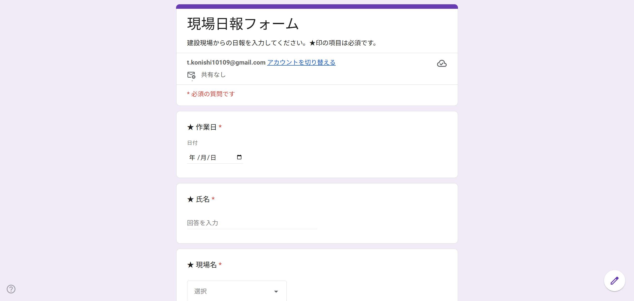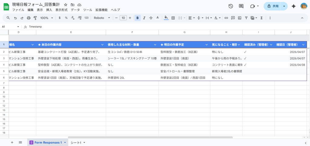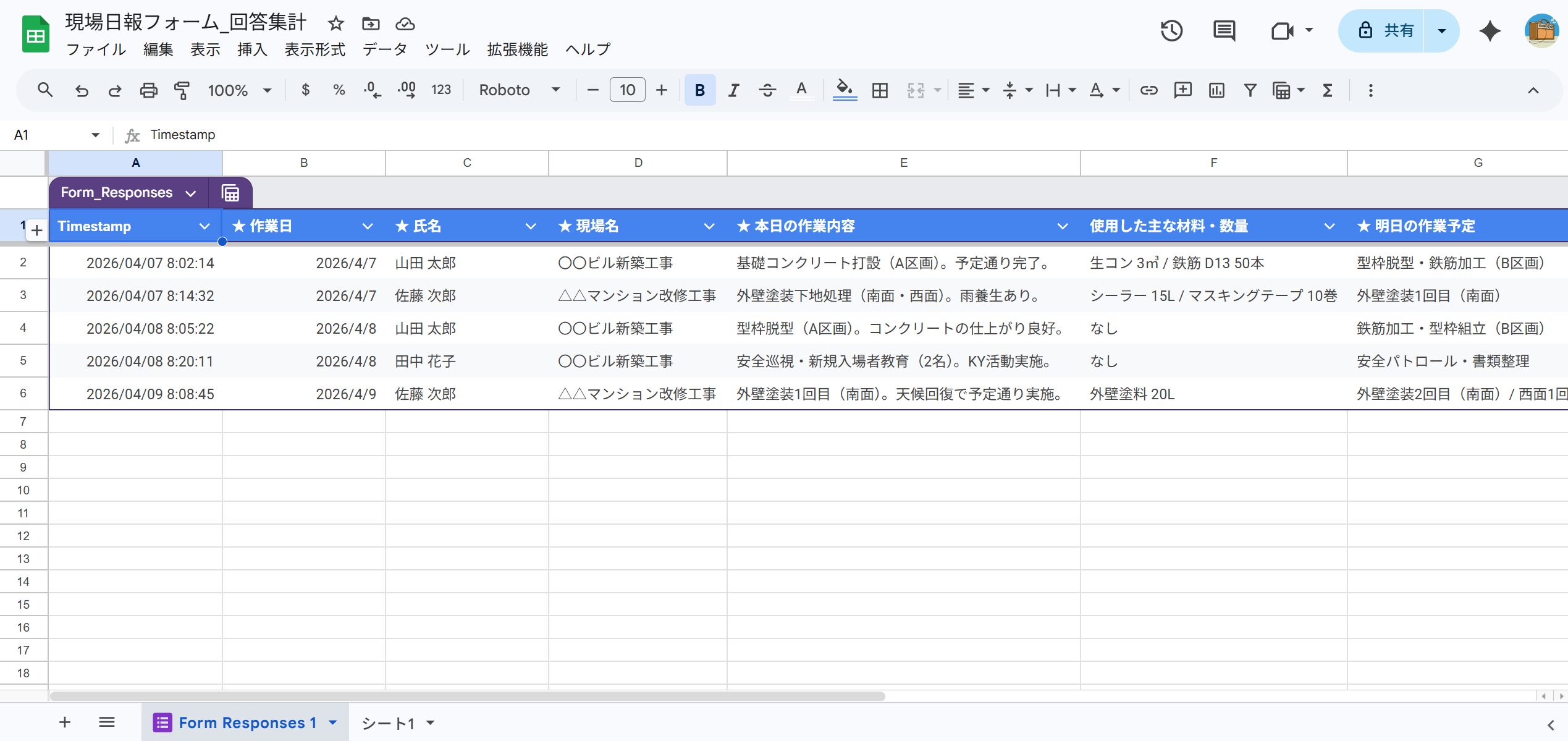 改善の第一弾は日報の統一です。Googleフォームで「作業内容・使用材料・翌日の段取り・施工写真」を入力できるシンプルな日報フォームを作成し、スマートフォンから送信するだけで回答がGoogleスプレッドシートに自動集計される仕組みに切り替えました。