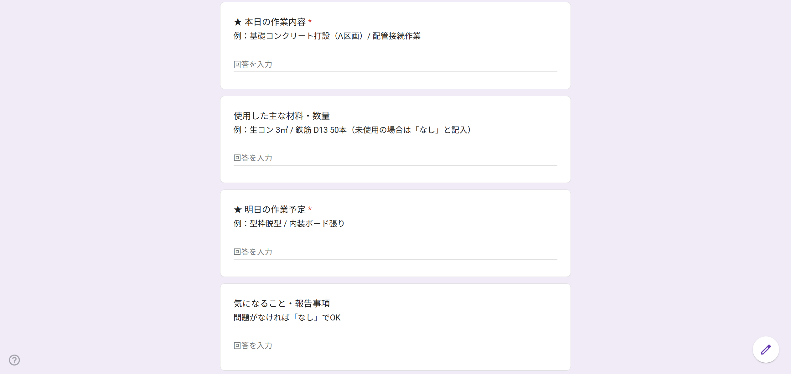 | 当日の作業報告 | Googleフォーム(日報フォーム) | 作業終了後30分以内 | 施工管理者 |