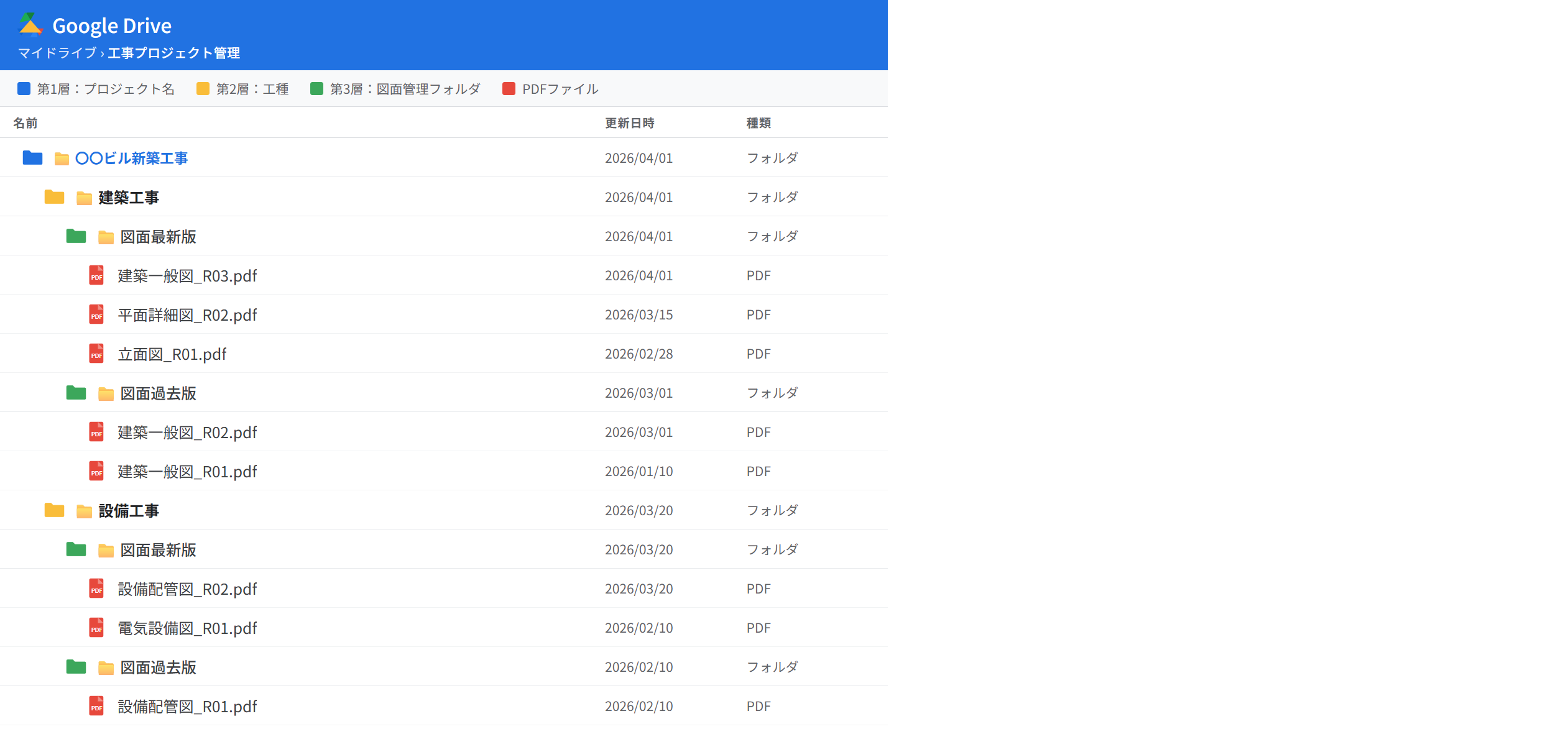 Google Driveは、パソコンでもスマートフォンでも同じファイルにアクセスできるため、現場と事務所の情報格差が生まれません。フォルダ構造を「プロジェクト名 > 工種(基礎・内装・設備など)> 図面最新 / 図面過去版」という3階層で統一し、最新版以外は「過去版」フォルダに移動するルールを徹底するだけで、「どのフォルダの何というファイルが最新か」が誰でも即座に判断できるようになります。Googleドライブのファイル共有権限を「閲覧のみ」に設定しておくことで、誤って古い版に上書きされるリスクも防げます。