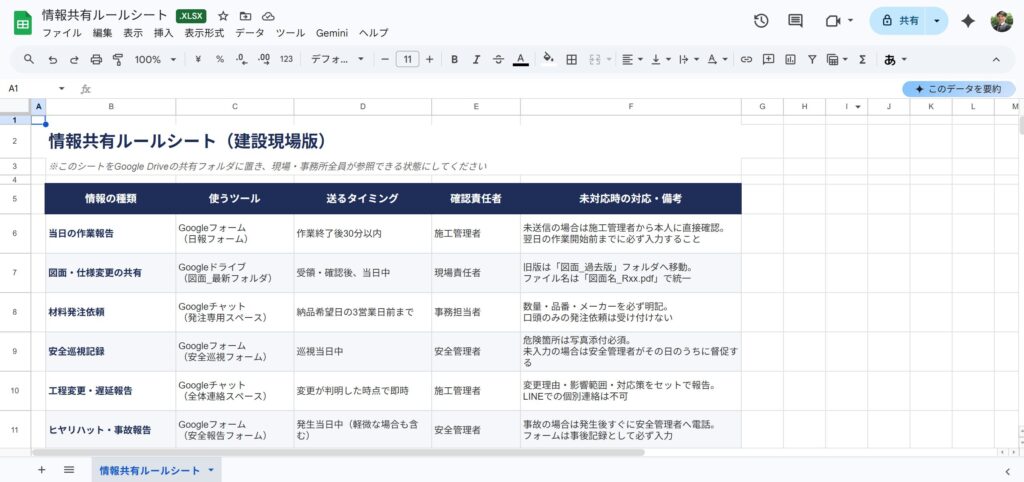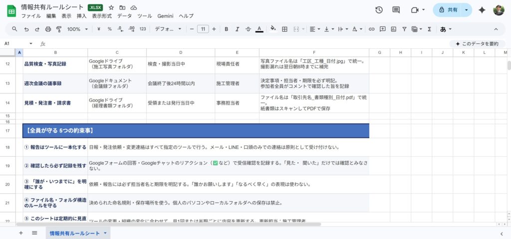 Googleスプレッドシートで次のような「情報共有ルールシート」を1枚作り、Google Drive上の共有フォルダに置きます。URLを共有するだけで全員が最新版を参照でき、ルールを変更しても再配布不要です。