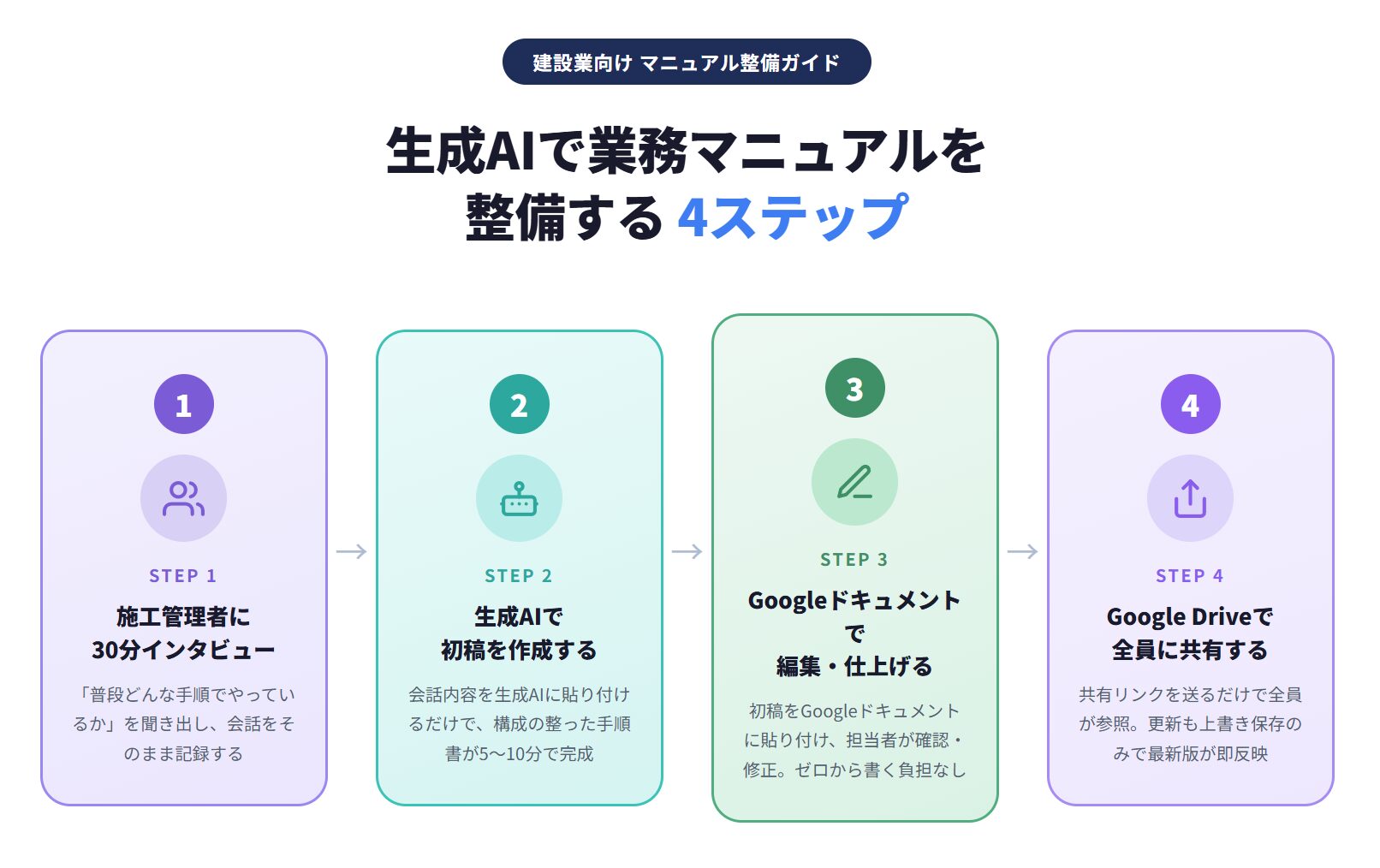 具体的な流れはこうです。施工管理者に「普段どんな手順でやっているか」をインタビューし、その内容をそのまま 生成AIに貼り付けて「施工管理業務の手順書として整理してください」と入力すると、構成の整った初稿が5〜10分で出来上がります。それをGoogleドキュメントに貼り付けてGoogle Drive上に保存すれば、管理者がスマートフォンやパソコンからいつでも確認・加筆でき、完成後は現場メンバーへの共有リンクを送るだけで全員が参照できます。
