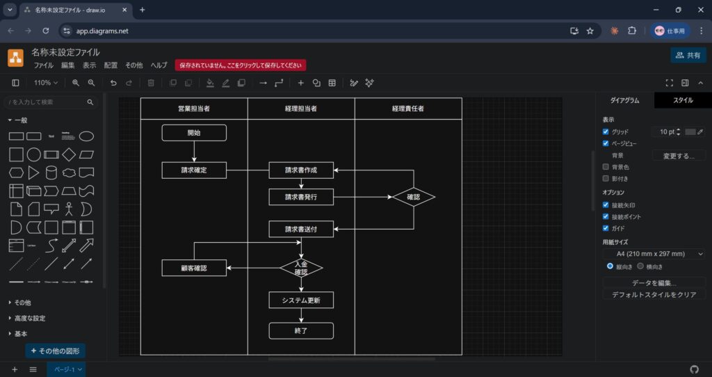 | draw.io(diagrams.net) | ブラウザで使える・機能豊富・共有しやすい | 完全無料 | スイムレーン付きの本格的な業務フロー図。中小全般 |