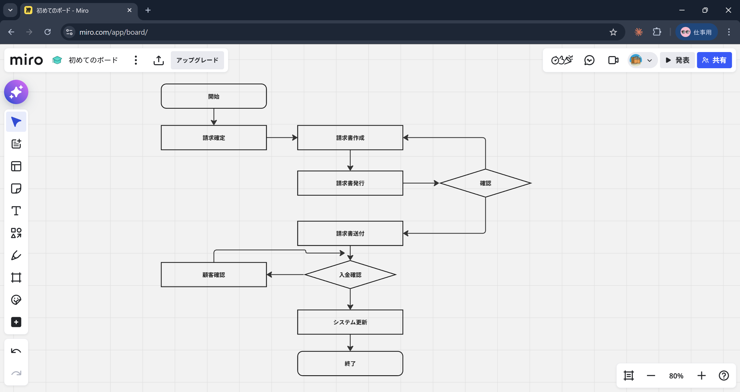 無料プランでは3ボードまで利用可能です(2026年3月時点)。複数人が同時にアクセスして編集できるため、チームで業務フロー図を作る場合や、離れた拠点とリアルタイムで確認しながら作業したい場合に適しています。