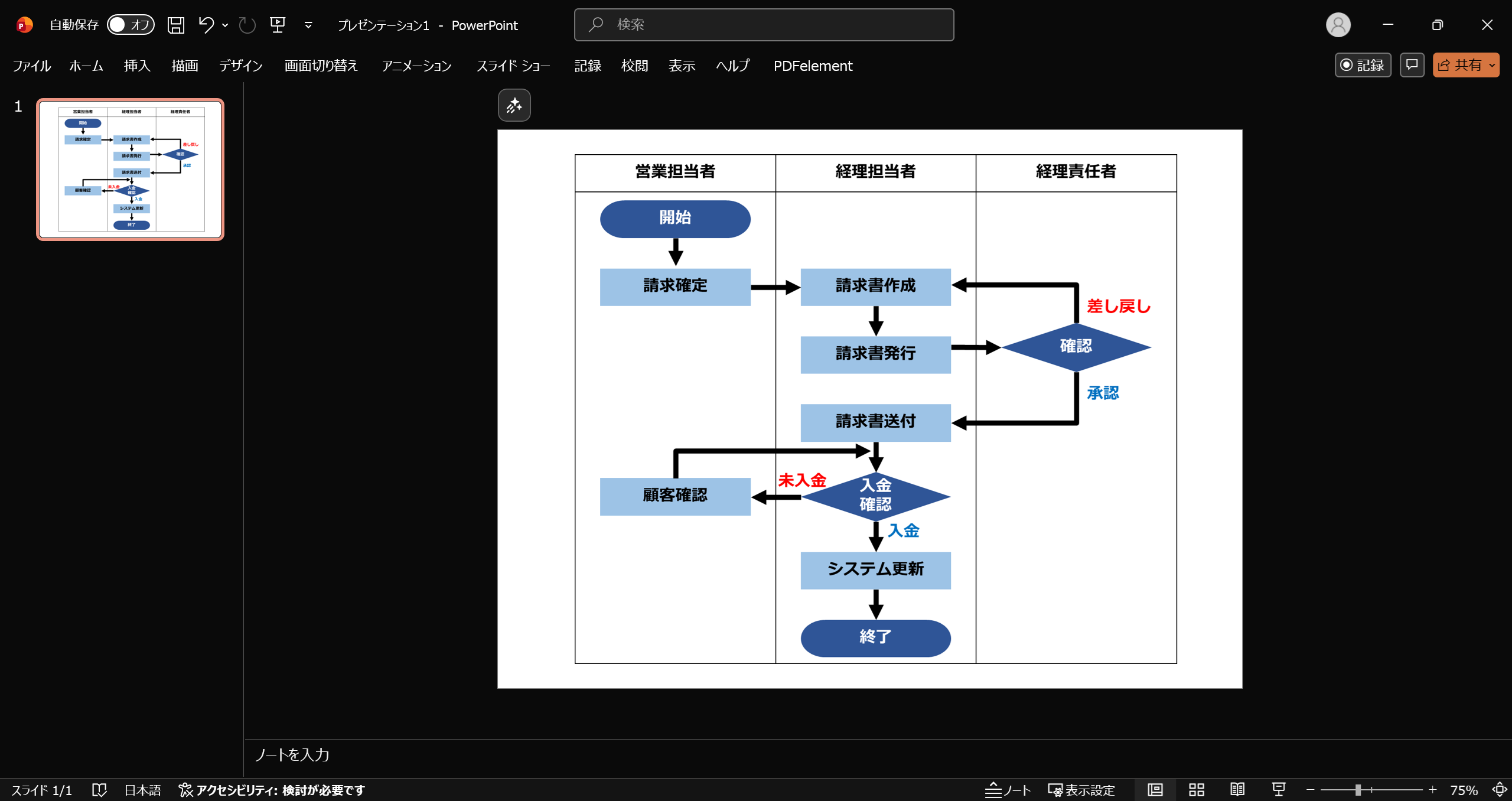 ただし、ここで完璧を目指しすぎないことが大切です。実務では「この条件は20件に1件しか発生しない」という例外もあります。頻度が低い例外は「別途相談」「都度判断」として記載し、本線の業務フロー図には含めないほうがシンプルに仕上がります。