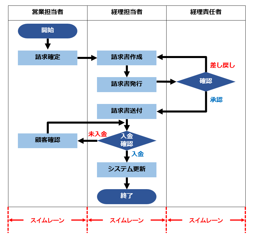 設定方法は、業務フロー図を縦方向または横方向に分割して、各ゾーンに担当者名や部門名を書くだけです。たとえば「営業担当者」「経理担当者」「経理責任者」の3レーンを設けることで、どの作業がどこで発生しているかが明確になります。