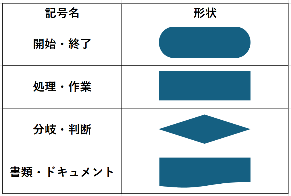 | 開始・終了 | 角丸長方形(スタジアム型) | フローの始まりと終わりを示す。 必ず1つずつ設ける |