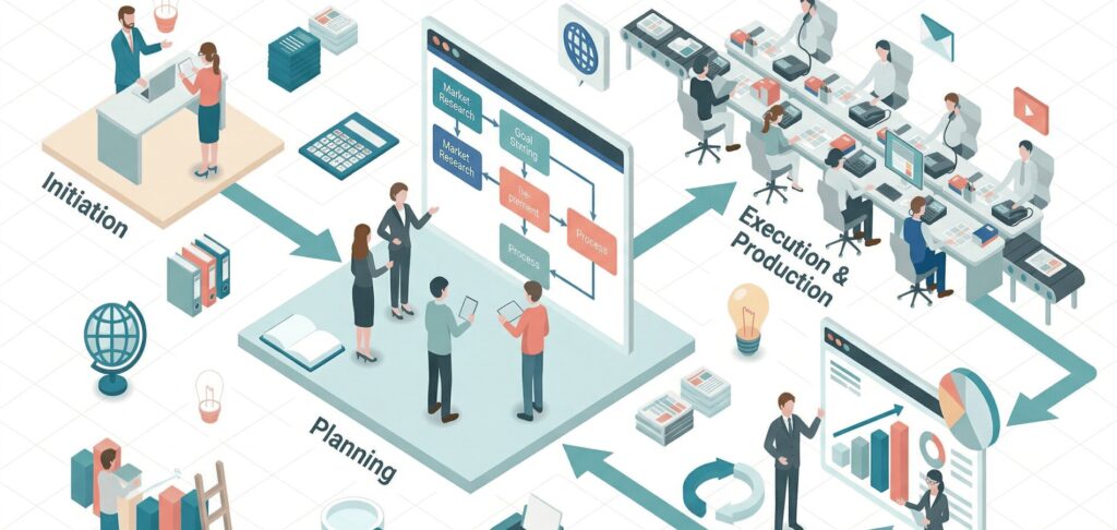 業務フロー図は作業の手順・担当者・分岐条件を時系列で表したものです。一方、業務プロセス図(バリューチェーン図など)は、業務全体の大きな流れや部門間の関係性を俯瞰するためのものです。