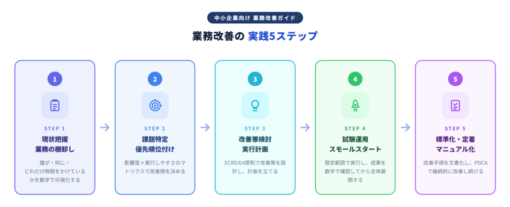 ここからが本題です。中小企業の現場で機能する業務改善の手順を、5つのステップで解説します。