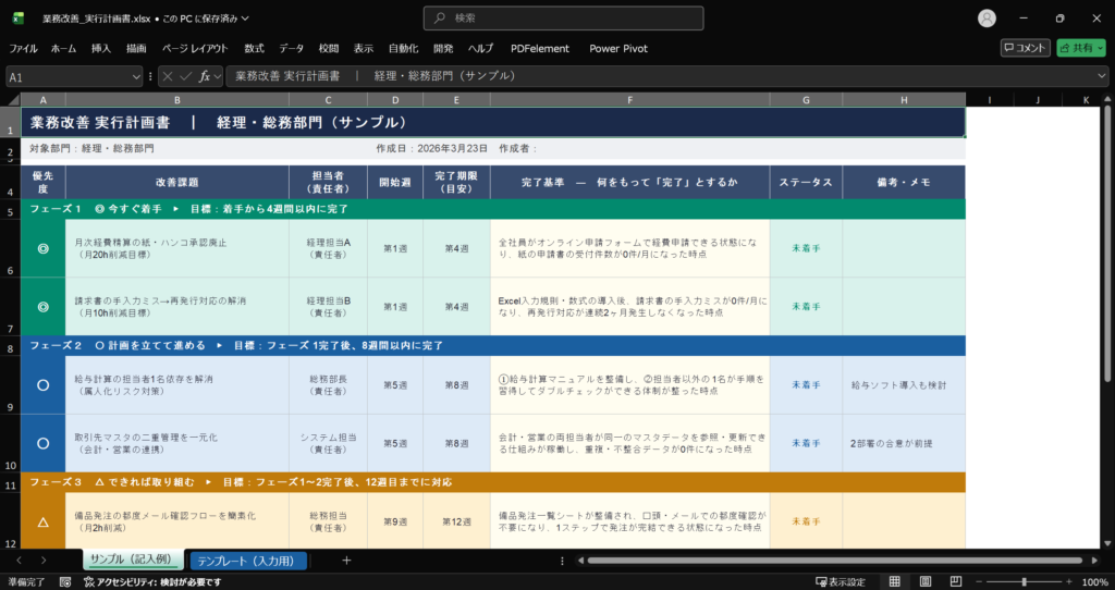 業務改善の取り組みは、まず◎(今すぐ着手)の2件から着手します。「経費精算のペーパーレス化」と「請求書入力のExcel自動化」は、担当者1〜2名で完結でき、1ヶ月以内に成果が見えやすい改善です。〇(計画を立てて進める)の2件はシステム導入や他部署連携が必要なため、◎の成功体験を作ってから取り組むと社内の合意を得やすくなります。
