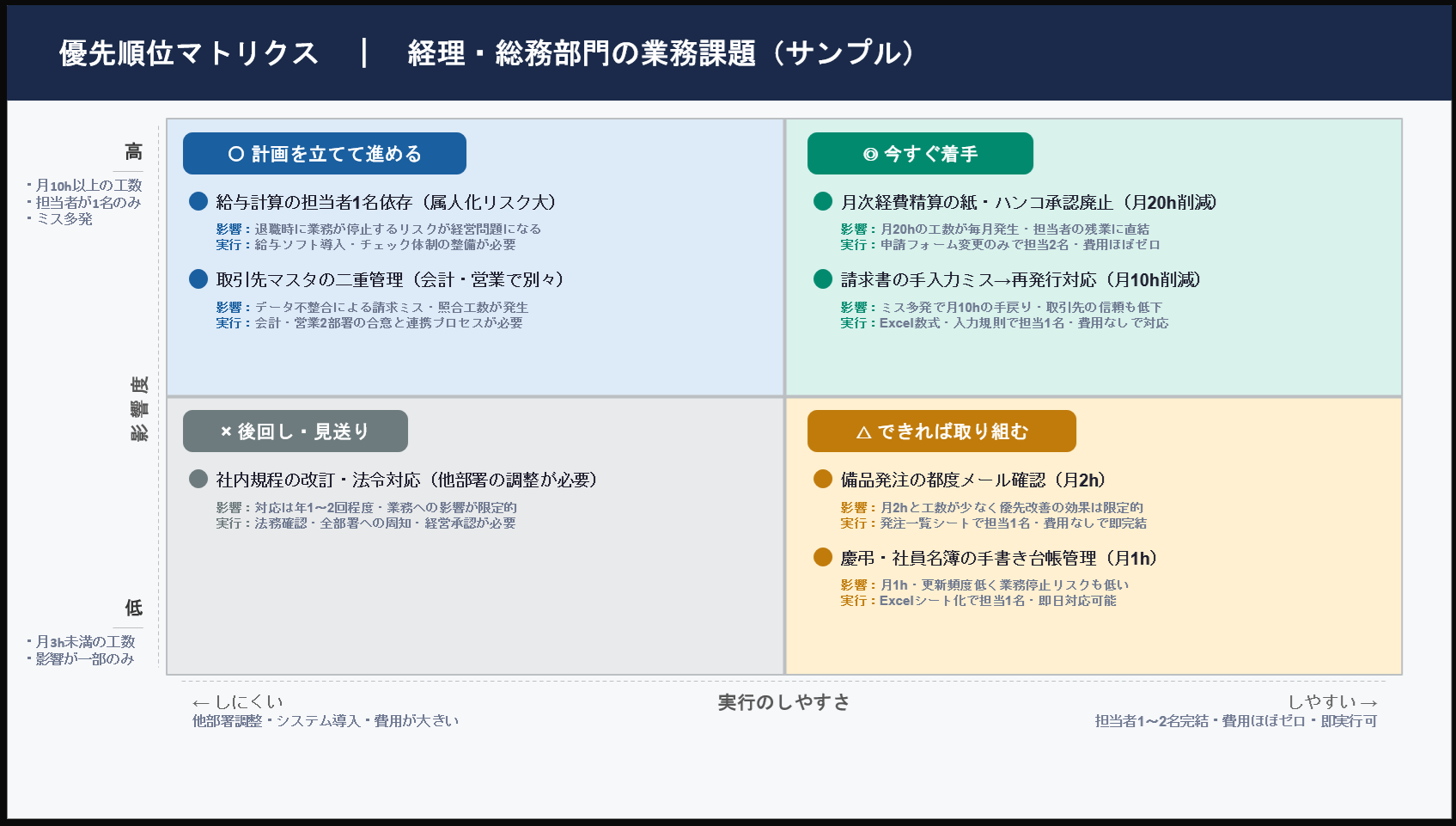 「影響度が大きく・実行しやすい」課題から始めることで、最短で成果を出し、組織内に「業務改善は効果がある」という成功体験を作ることができます。