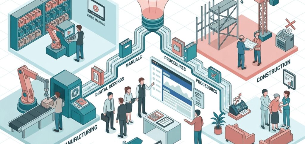 基本的な進め方(棚卸し→優先順位付け→改善の実行→定着)はどの業種でも共通しています。ただし、課題の中身と改善策の具体的な内容は業種によって異なります。製造業なら技術の標準化、建設業なら情報連携の統一、介護ならマニュアルと記録業務の効率化が、それぞれの中心的なテーマになることが多いです。