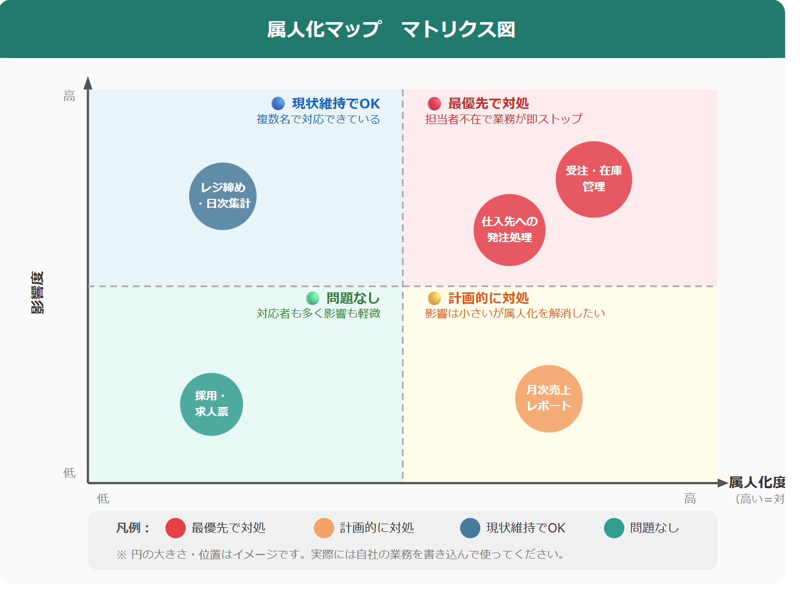 縦軸を「影響度(業務が止まったときの深刻さ)」、横軸を「属人化度(対応できる人数の少なさ)」としたマトリクスを作り、各業務を当てはめます。右上(影響度が高く・属人化度も高い)に位置する業務が最優先の対処対象です。