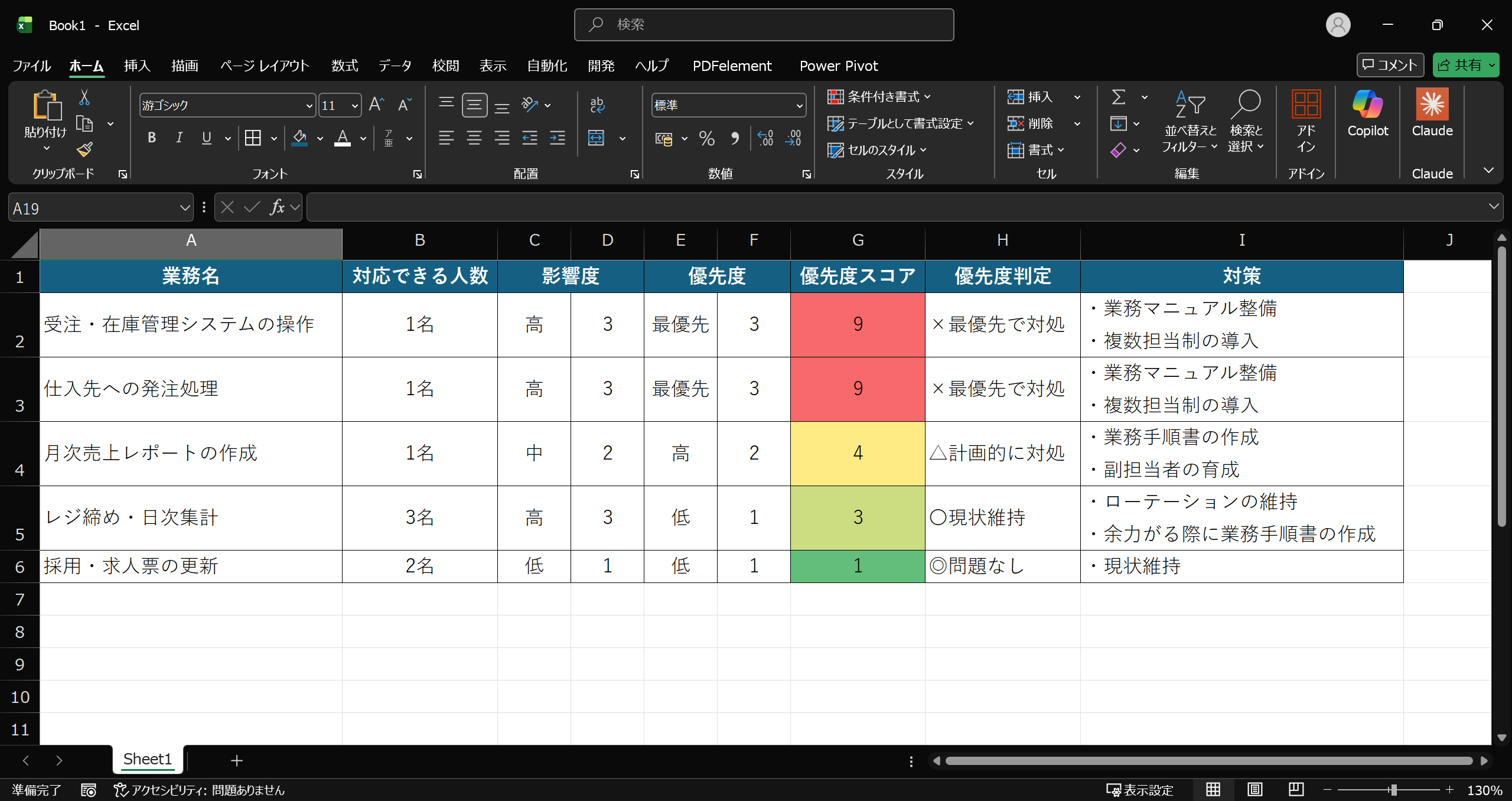 この表を見ると、「受注・在庫管理システムの操作」と「仕入先への発注処理」が1名しか対応できず、かつ業務が止まると売上に直結するため、最優先で対処すべきと判断できます。一方、「レジ締め」は3名が対応できるため、今すぐ手を打つ必要性は低いことが分かります。